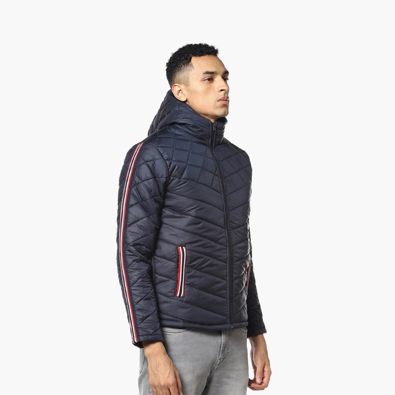 الأزرق الداكن الهندسي الذاتي تصميم سترة مبطنة ، لديه غطاء رأس ، جيوب 2 ، لديه إغلاق الرمز البريدي ، أكمام طويلة ، حاشية مستقيمة ، بطانة من البوليستر.