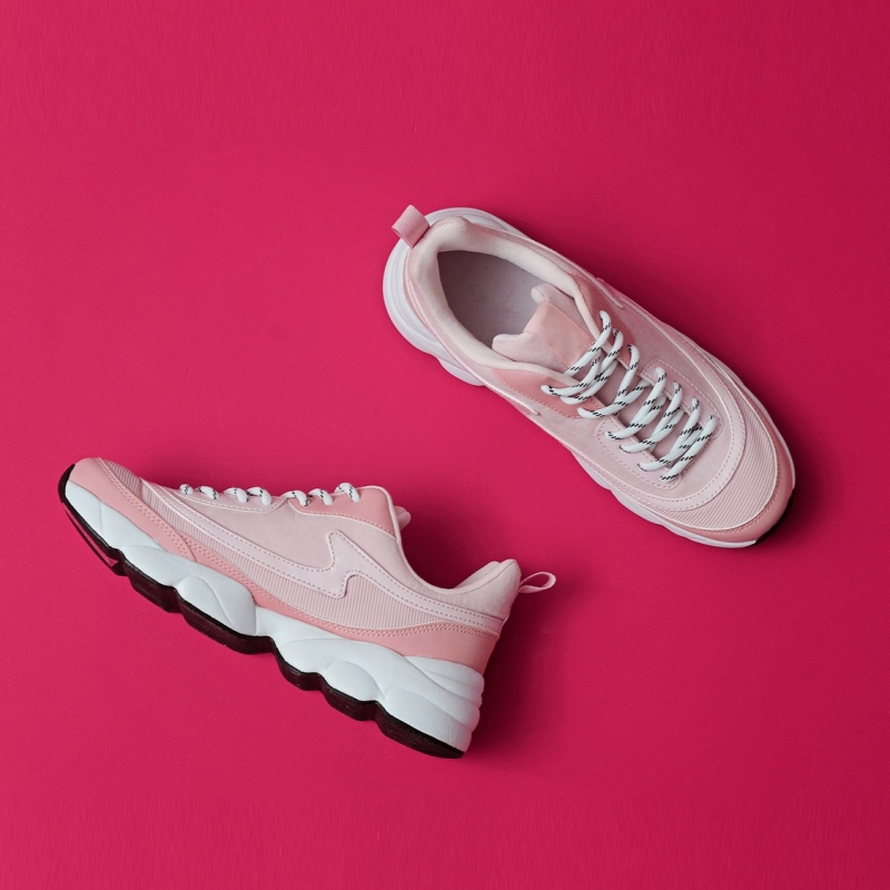 زوج من أحذية المشي الوردية، وتصميم منتظم، وتفاصيل الأربطة