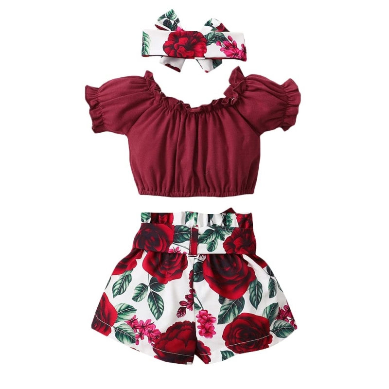 بلوزة بنات الحجلة ومجموعة قصيرة بطبعة الأزهار مع عقال من القطن والبوليستر باللون الأحمر