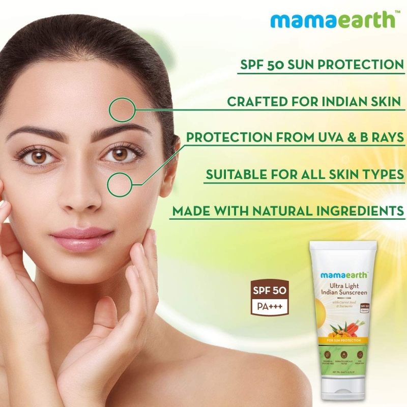 Crema de protección solar india de Mamáearth Ultra Light con semilla de zanahoria