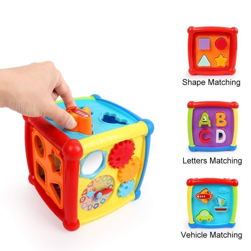 • 6 in 1 Multi-function - The baby sorting toy includes shape block,alphabet block, vehicles blcok,alphabet cognition,music learning and time learning center. Exquisite mirror and rotatable gears of cute colorful Cube is enough to attract the baby's attention,the most important is that it can be used as excellent block storage box