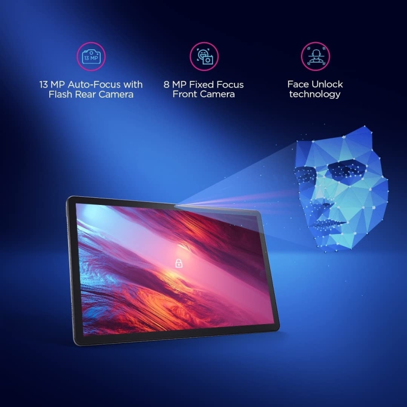 • Battery power - 7700 mAH battery| 15 hours playback time; charger wattage - 20W, 13 MP Auto-Focus with Flash Rear Camera, 8 MP Fixed Focus Front Camera