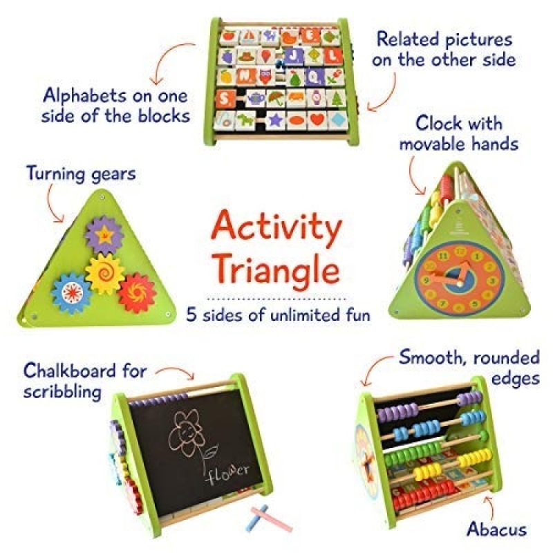 • 5-IN-1 MULTI ACTIVITY TOY: Long lasting premium quality wooden 5-sided multi-activity toy, with abacus, alphabet swivel blocks with pictures, chalkboard, clock and wooden gears, makes it fun for your child to understand important preschool learning concepts.