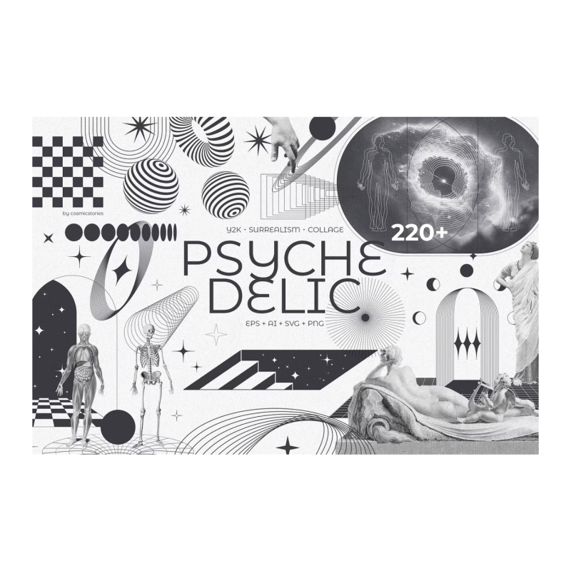 The Psychedelic Archives is a huge collection of trendy graphics and carefully isolated elements made to let your creativity fly and create fantastic surreal scenes in a unique dream-made aesthetic. This collection is perfect for portraying spiritual or surreal concepts with eye-catching visuals and retro-tech cyber vibes from the 90s to the 00s.