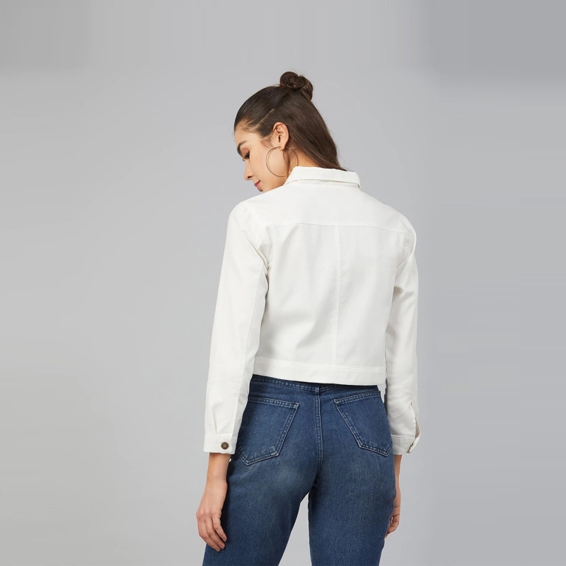 White solid jacket, has a spread collar, 2 pockets, button closure, long sleeves, straight hem, and cotton